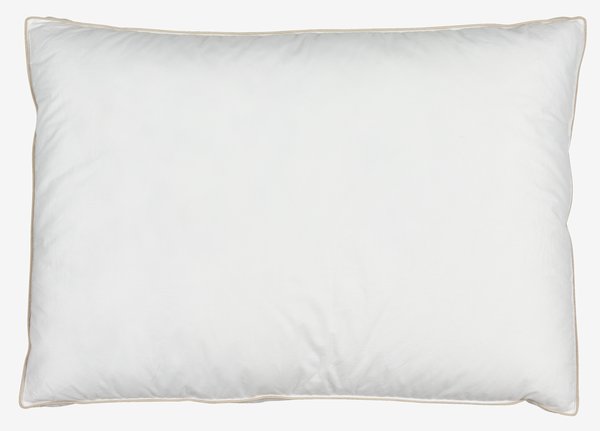 Guanciale 50x70 cm con 3 camere e cuciture a riquadri. Il guanciale mantiene la sua forma e fornisce un supporto omogeneo. Imbottitura in 100% fibra di poliestere nelle camere esterne e 100% piume d'anatra nella camera interna, 1.220 g. Fodera in 100% cotone. Lavabile a 60°C.