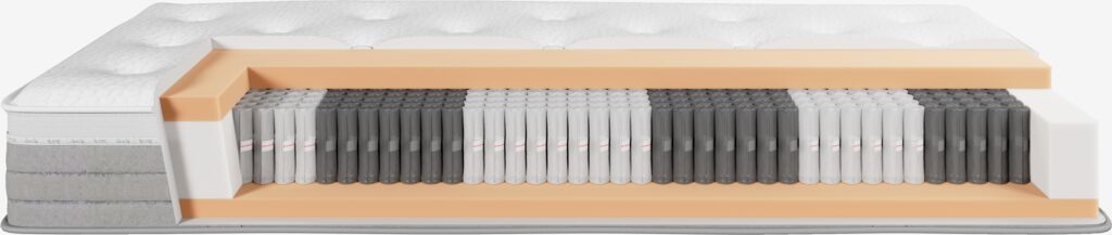 | Strato di molle 1 (dall'esterno) | 14 cm Ogni molla pocket è protetta da una tasca in tessuto che rende il materasso flessibile, ne aumenta la durata e riduce il rumore. |