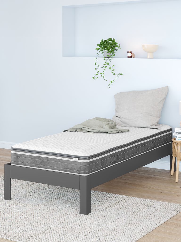 Materasso 80x190 cm reversibile e alto 27 cm con 380 molle insacchettate, diviso in 7 zone di comfort. Imbottitura in schiuma di polietere. Il materasso presenta la marcatura CE ed è riconosciuto come dispositivo medico secondo MDR 745/2017. Fodera elasticizzata con trapuntatura spessa in memory foam che allevia la pressione da un lato e schiuma di polietere dall'altro. Fodera con microcapsule che regolano la temperatura corporea e contribuiscono a creare un ambiente del sonno fresco e asciutto.