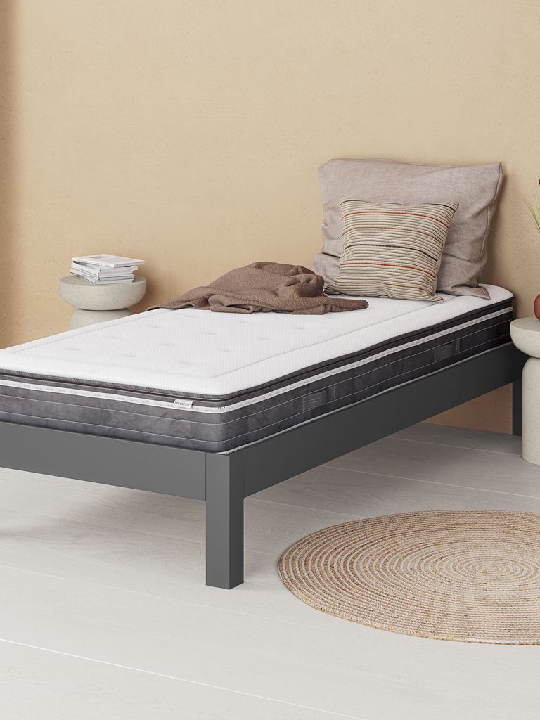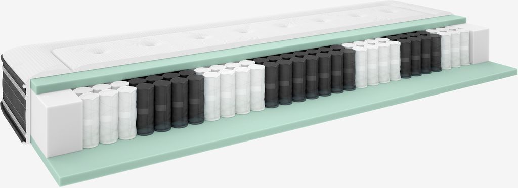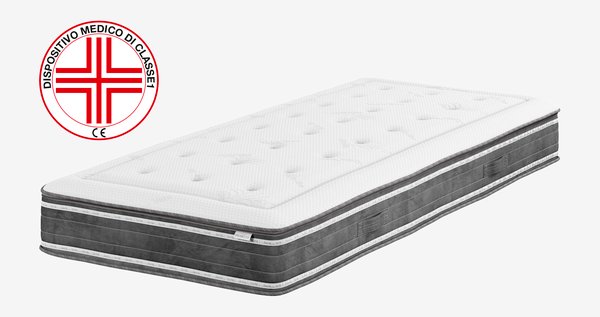 Materasso a molle reversibile 90x200 cm alto 25 cm con 2 diversi livelli di rigidità e molle pocket 439 e diviso in 7 zone di comfort che offrono un supporto unico ed ergonomicamente corretto. Imbottitura in schiuma di polietere. Il materasso presenta la marcatura CE ed è riconosciuto come dispositivo medico secondo MDR 745/2017. La fodera lavabile è elasticizzata e trattata con aloe vera ammorbidente. Inoltre, è dotata di trapuntatura spessa in memory foam da un lato e schiuma di polietere dall'altro.
