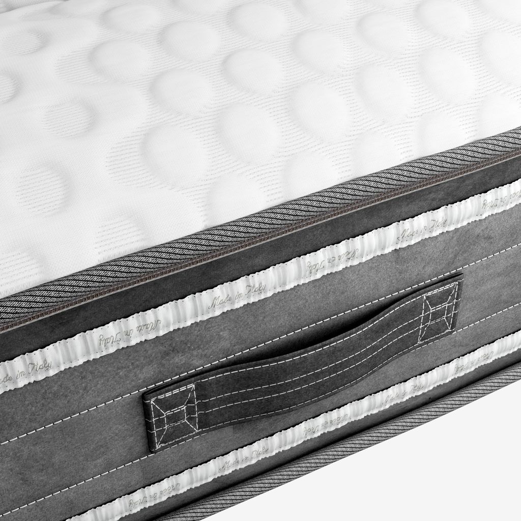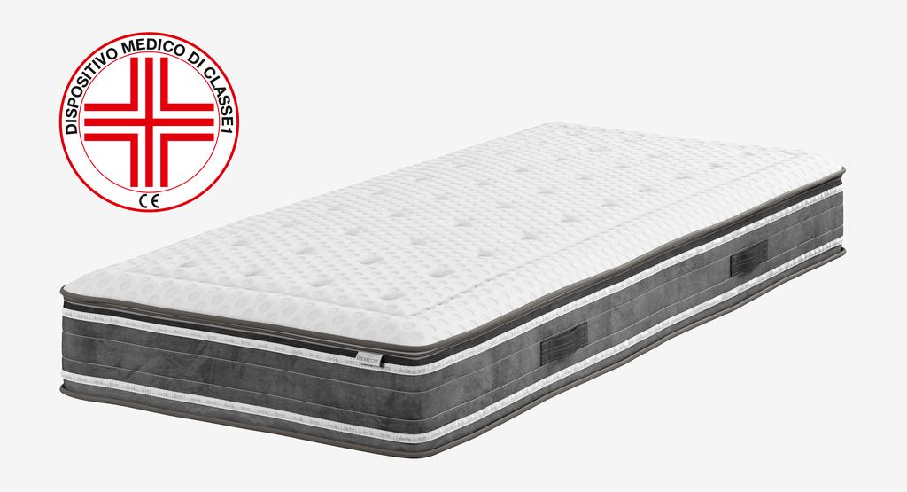Materasso 90x200 cm reversibile e alto 27 cm con 439 molle insacchettate, diviso in 7 zone di comfort. Imbottitura in schiuma di polietere. Il materasso presenta la marcatura CE ed è riconosciuto come dispositivo medico secondo MDR 745/2017. Fodera elasticizzata con trapuntatura spessa in memory foam che allevia la pressione da un lato e schiuma di polietere dall'altro. Fodera con microcapsule che regolano la temperatura corporea e contribuiscono a creare un ambiente del sonno fresco e asciutto.