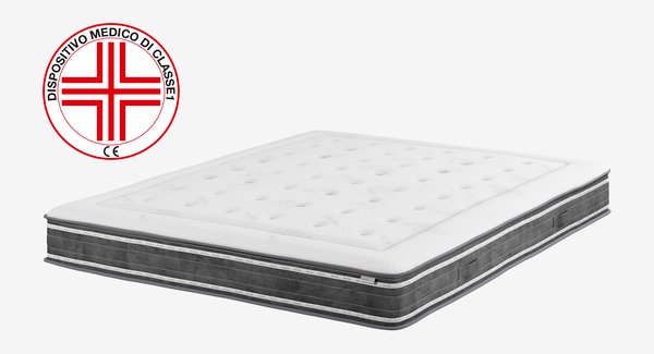 Materasso in schiuma 160x190 cm con con 2 diversi livelli di rigidità e anima di 19 cm in schiuma di polietere. Il materasso presenta la marcatura CE ed è riconosciuto come dispositivo medico secondo MDR 745/2017. Fodera elasticizzata con trapuntatura spessa in memory foam che allevia la pressione da un lato e schiuma di polietere dall'altro. Fodera sottoposta a trattamento ammorbidente con aloe vera.