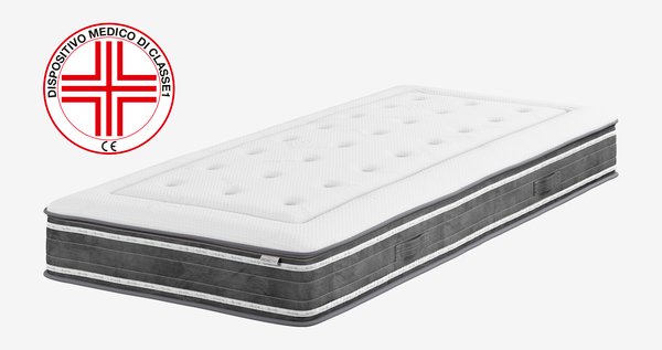 Materasso in schiuma 90x200 cm con 2 diversi livelli di rigidità e anima di 19 cm in schiuma di polietere. Il materasso presenta la marcatura CE ed è riconosciuto come dispositivo medico secondo MDR 745/2017. Fodera elasticizzata con trapuntatura spessa in memory foam che allevia la pressione da un lato e schiuma di polietere dall'altro. Fodera sottoposta a trattamento ammorbidente con aloe vera.