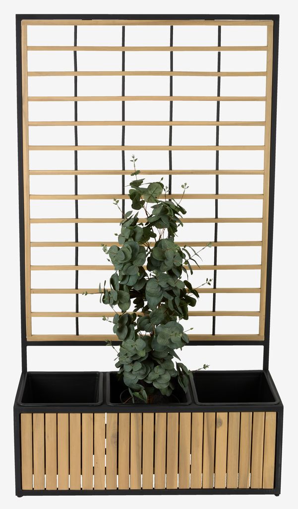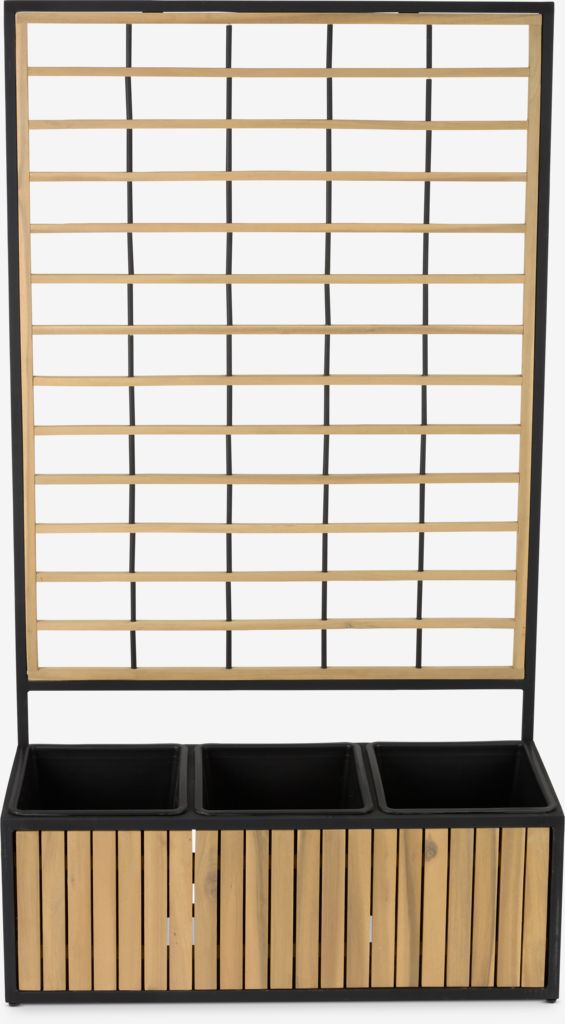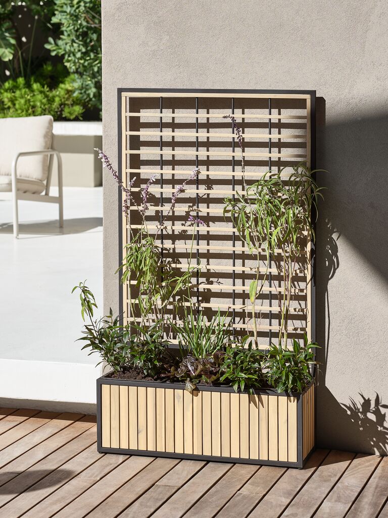 Fioriera a cassetta con grigliato, realizzata in legno massello FSC® oliato, acciaio galvanizzato e plastica. Ideale per creare una recinzione verde attorno al tuo terrazzo o per dividere il tuo spazio esterno. Il grigliato offre supporto alle piante rampicanti e, quando coperto, dona un effetto bello e decorativo. Un foro di drenaggio può essere facilmente fatto per garantire lo scolo dell'acqua in eccesso. P27 x L74 x H131 cm
