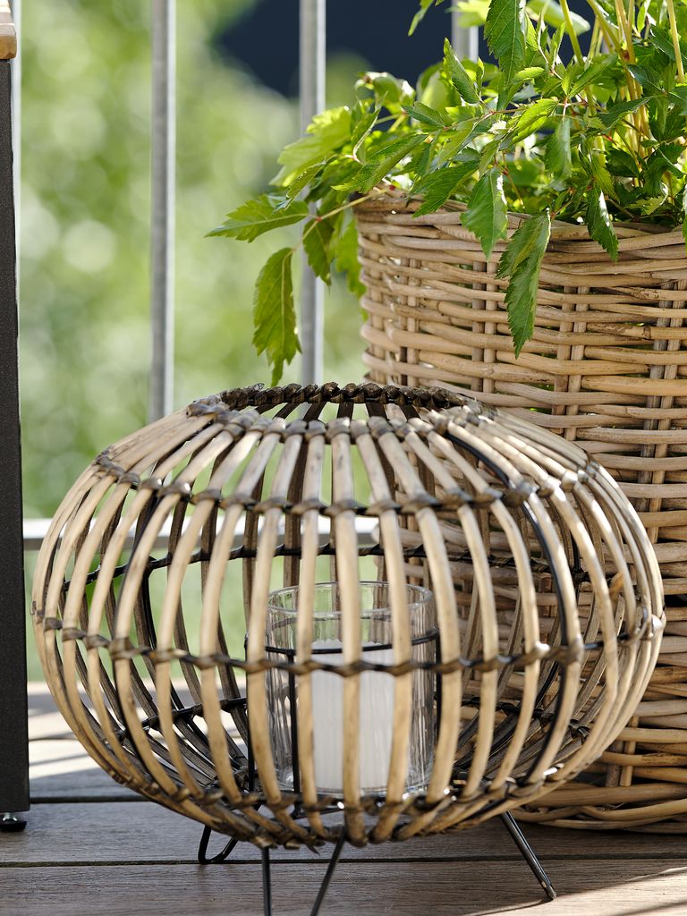 Lanterna rotonda in polyrattan, acciaio e salice di colore naturale, che dona un'atmosfera incantevole al tuo giardino. Il contenitore in vetro all'interno si adatta bene a una candela a colonna. Ø32 x H26 cm