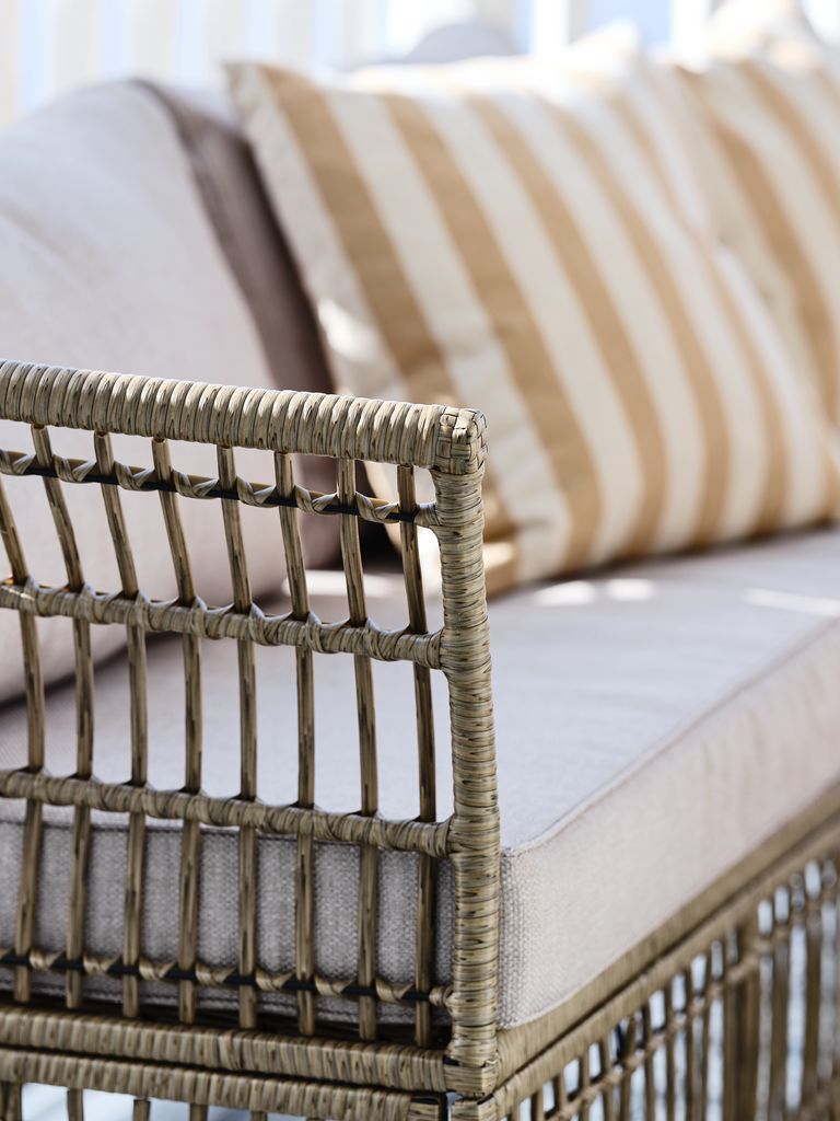 Divano lounge 3 posti in acciaio e polyrattan. Incl. cuscini di alta qualità con fodera resistente in tessuto intrecciato. L177 x H75 x P74 cm