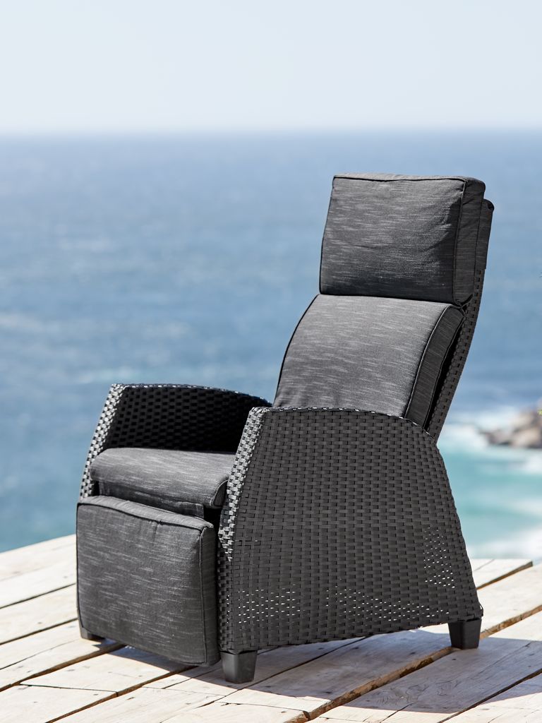 Poltrona da giardino in alluminio e polyrattan. Schienale ribaltabile e poggiagambe regolabile. Incl. cuscini di alta qualità con fodera in tessuto intrecciato. L66 x H102 x P80 cm