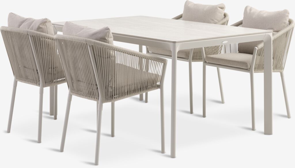 Set mobili da giardino 4 posti. Tavolo: alluminio e ceramica. Il piano in ceramica è resistente a graffi, macchie e calore. P95 x L150 x H74 cm. Sedia: alluminio e poliestere. Inclusi cuscini di qualità con fodera in tessuto strutturato ad asciugatura rapida. Impilabile.
