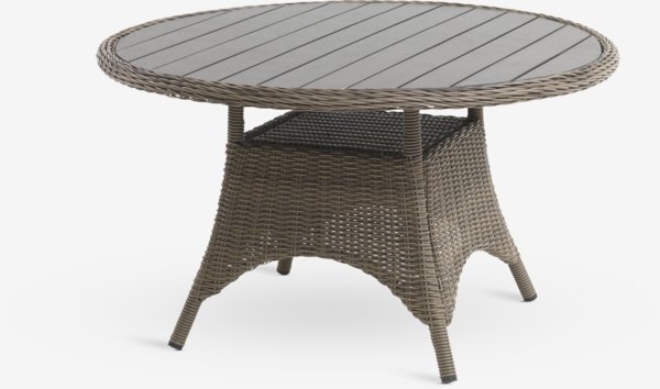 Tavolo da giardino rotondo con piano grigio in legno artificiale. Struttura e gambe in polyrattan e alluminio verniciato a polvere. Il ripiano sotto il piano è ideale per riporre oggetti più piccoli come riviste e sottobicchieri. Il legno artificiale ha l'aspetto e la texture del legno naturale senza necessità di manutenzione. L'alluminio è un materiale leggero, robusto e resistente alla ruggine. Ø130 x H74 cm