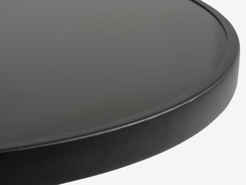 Tavolo da balcone rotondo con piano in vetro temperato e gambe nere in acciaio verniciato a polvere. Ø60 x H70 cm