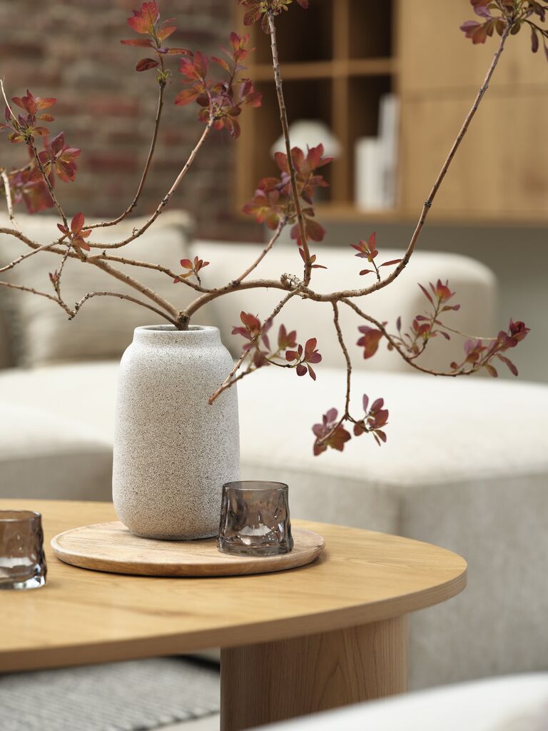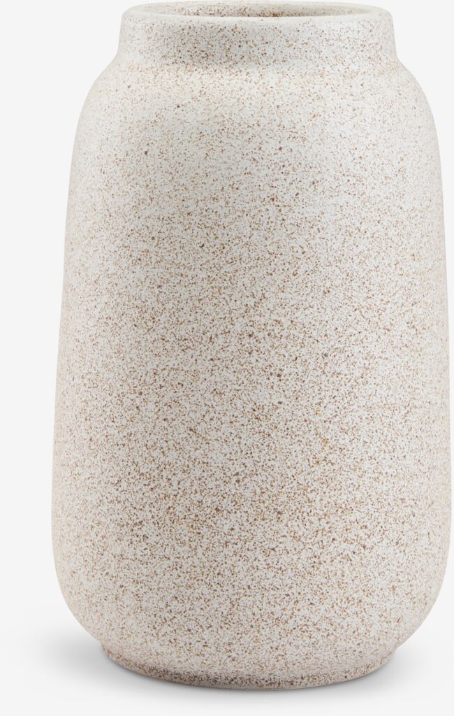 Vaso in terracotta bianco con un sottile motivo a macchioline e una forma liscia e arrotondata che conferisce un aspetto minimalista. Si presenta magnificamente anche da solo come decorazione. Ø14 x H23 cm