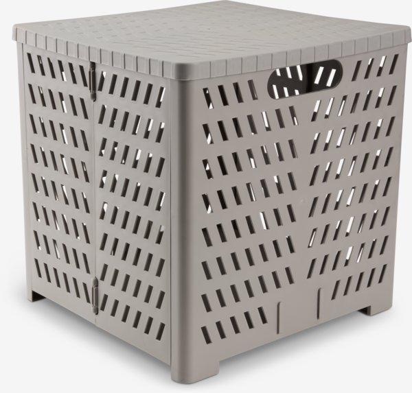 Cesto pieghevole con coperchio realizzato in plastica (100% riciclato) di colore grigio caldo. Ideale per riporre di tutto, dai giocattoli agli articoli per hobby, fino a coperte e libri. P28 x L30 x H30 cm