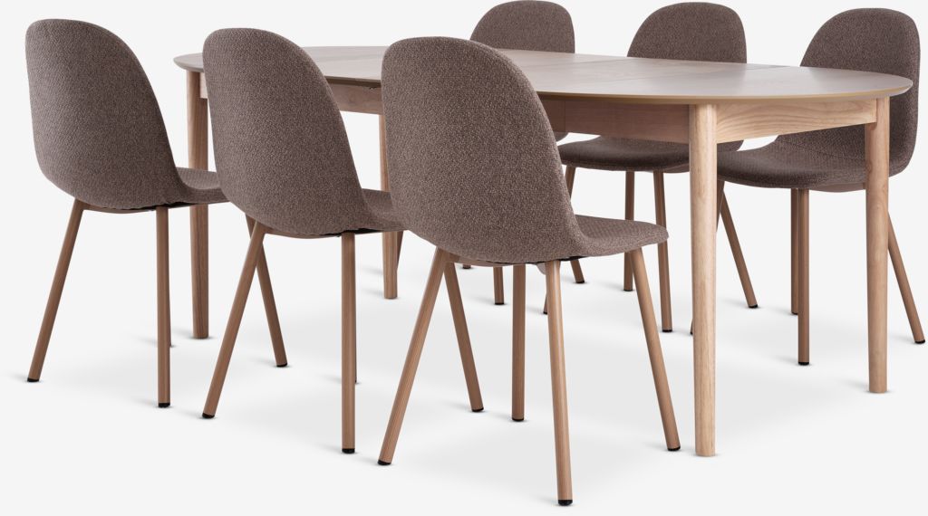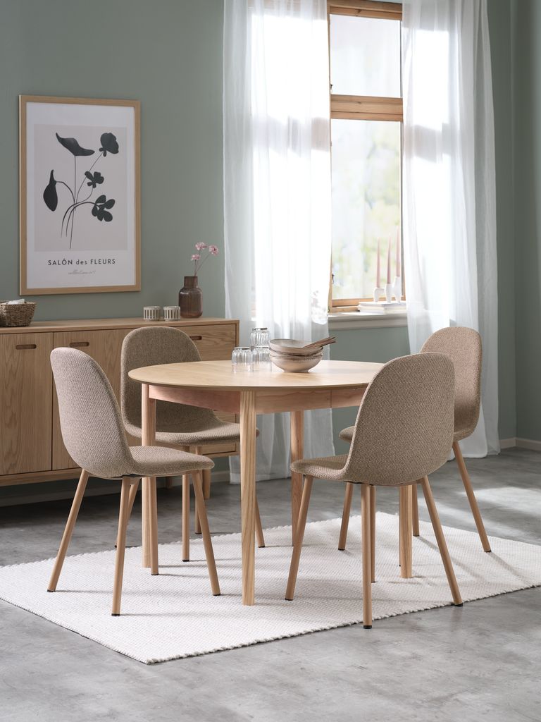 Tavolo: in legno massello e impiallacciatura di rovere. Ø110 x H75 cm. Incl. 2 prolunghe. Misure da esteso P110 x L200 x H75 cm. Sedia: in tessuto e acciaio.