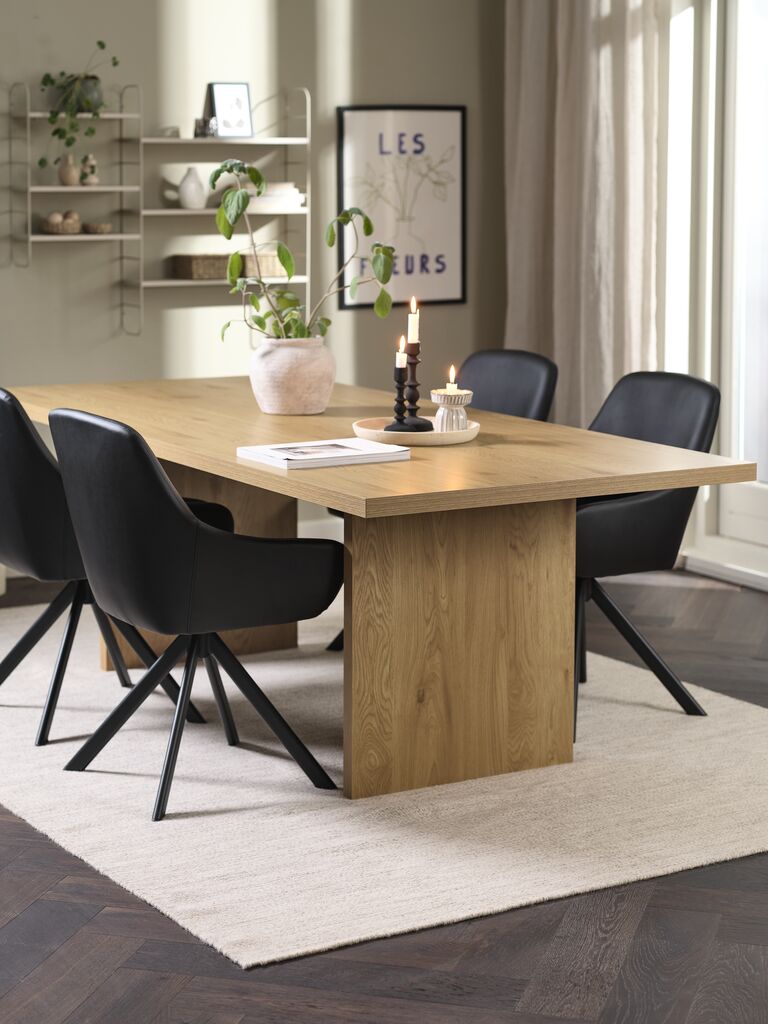 Tavolo: impiallacciatura decorativa. P100 x L220 x H75 cm Sedia: in similpelle. Con base girevole in acciaio.