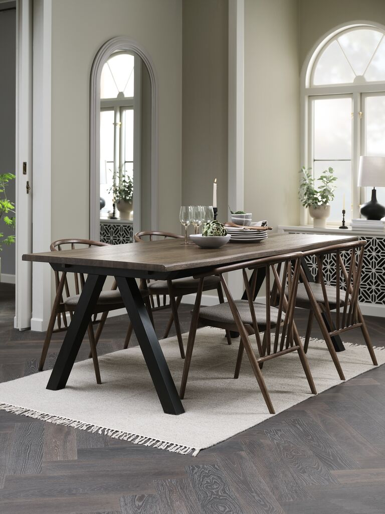 Tavolo: in legno massello e impiallacciatura di rovere. Escl. prolunghe. P100 x L210 x H75 cm Sedia: in tessuto e rovere massello.
