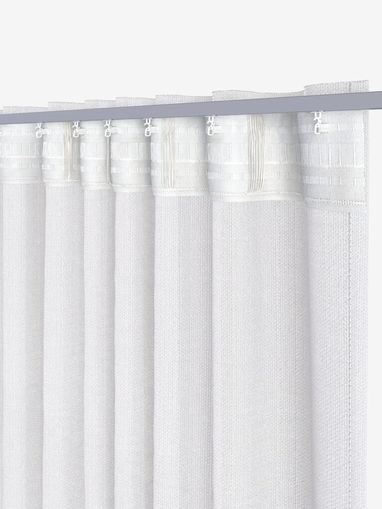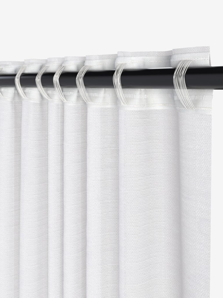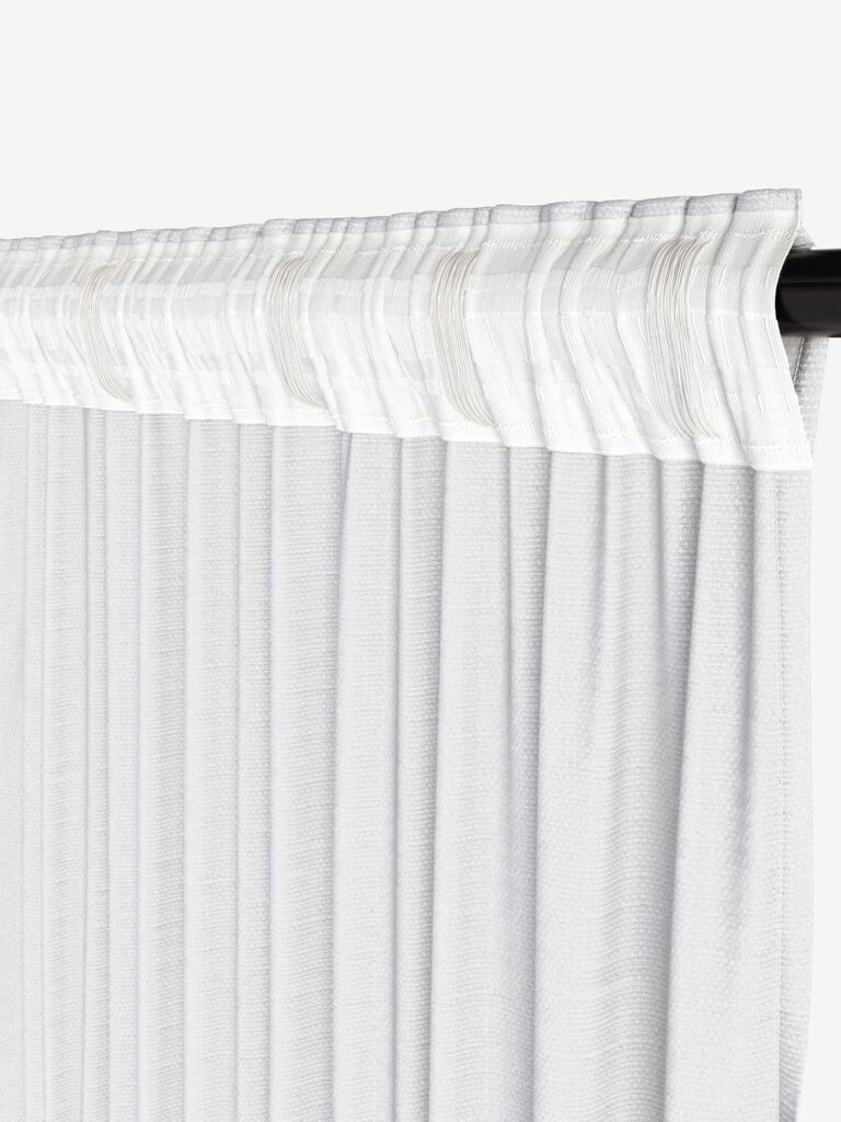 100% poliestere (50% riciclato). Con tasca per asta, fettuccia per tenda e passanti nascosti. 1 x L140 x H245 cm