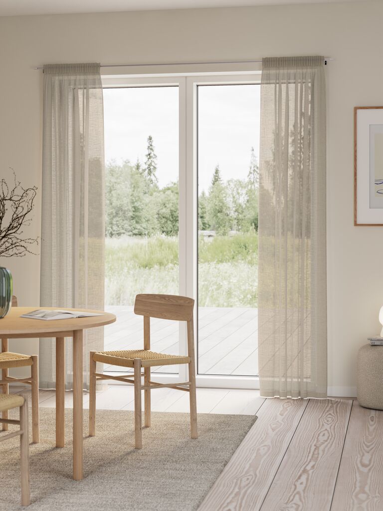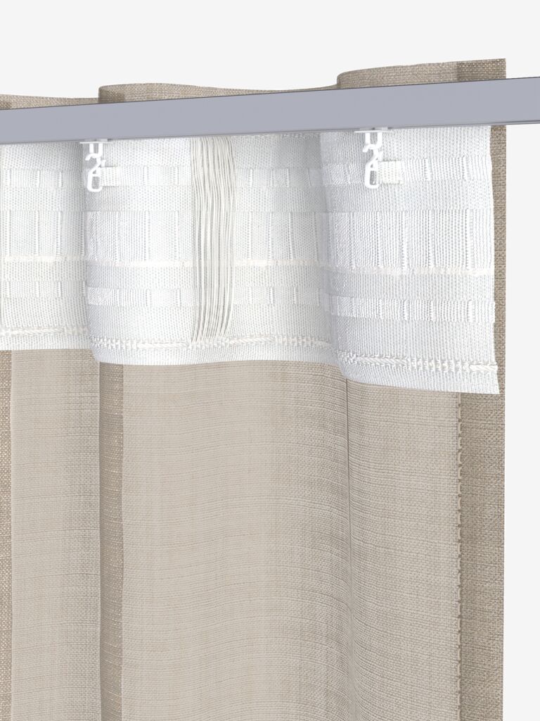 100% poliestere (100% riciclato). Con tasca per asta, fettuccia per tenda e passanti nascosti. 1 x L140 x H245 cm
